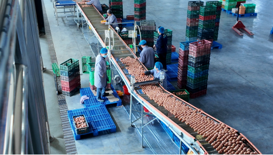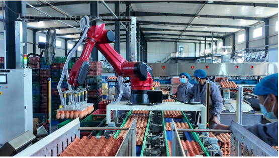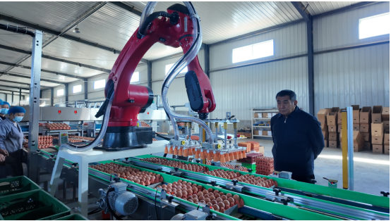 赤色机械臂轻盈弹性,60枚鸡蛋被精准吸起后稳稳放入蛋托,全程无一丝磕碰走进济南长田实业有限公司旗下易丰农业蛋鸡饲养场的分拣车间,眼前的场景让人似乎置身高端制造业车间。但仔仔细细地调查便会发现,传送带上翻滚的是新鲜鸡蛋这不是工业流水线,而是一家农业企业的智能出产现场。
